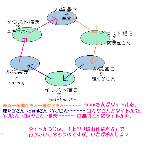 ・リレー小説+イラスト、というのを、順番を工夫してみることで