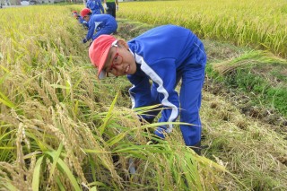 稲の根元から鎌を引くように気を付けながら