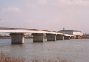 市内を流れる米代川とそれに架かる能代大橋です。 対岸から市街地方面を撮影しました。 橋の袂にある建物は能代市総合体育館です。 毎年5月に行われるバスケットボール「能代カップ」の 開催される体育館です。