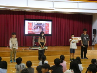 10月の全校集会は、峰浜小開校10年を祝う学習発表会の全校合唱曲「ふるさとはずっと」について説明しました。NHKの番組に紹介されたこと、全国的な話題になったことなど、旧水沢小学校当時のエピソードを紹介しました。