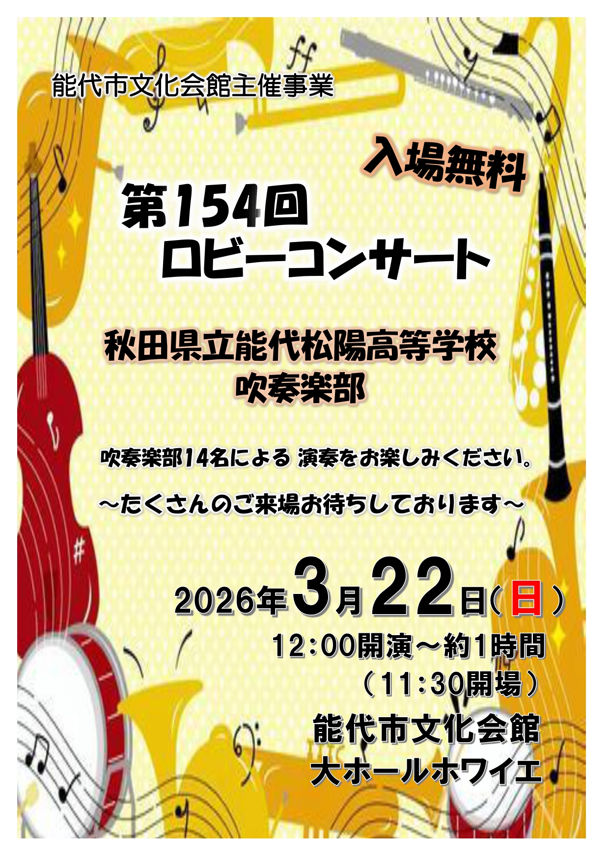 | 3月 | 22日 | (日) | 第154回『能代松陽高校吹奏楽部』 | |