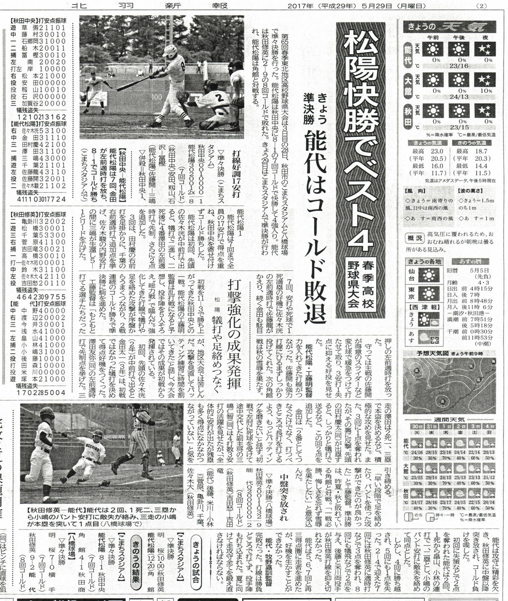 2017/5/13(土) 2回戦(準々決勝)は田代球場で行われた。秋田北鷹高校と対戦し 5−3 で勝利。準決勝は15日に能代球場で行われる予定