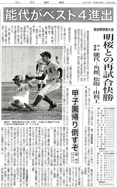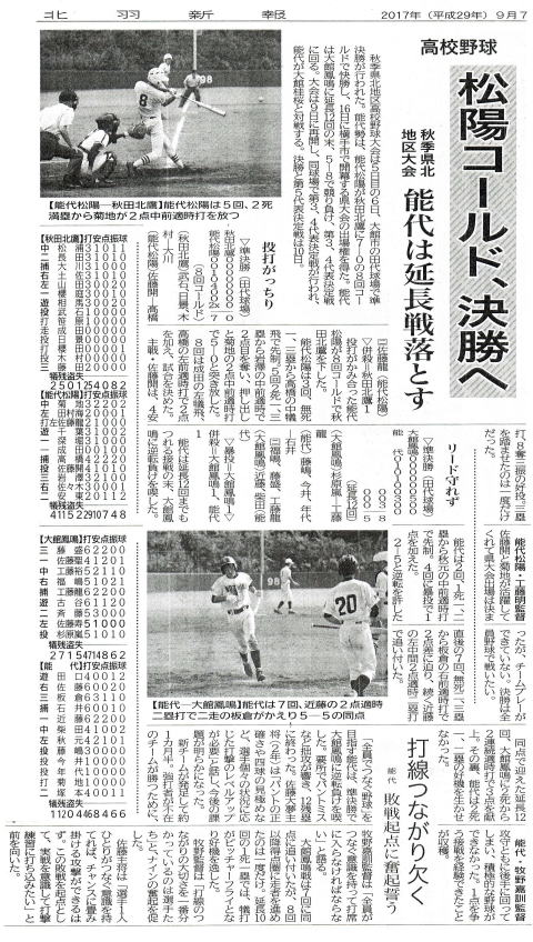 2017/9/02(土) 昨日の秋季県北地区高等学校野球大会の結果が北羽新報に報じられていた。紙面ではこの下に能代工監督の菊池和仁氏(本校OB)の談話が載っているが、紙面の都合で割愛した。