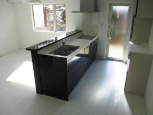 システムキッチンはLIXILアレスタ対面スタイルで高光沢ジェットブラックでまとめました。