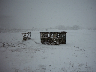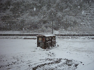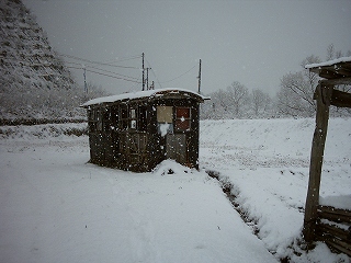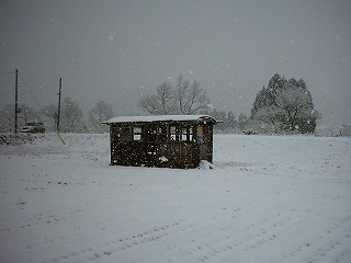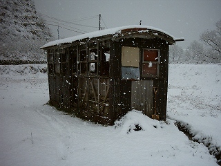 @''''''''''''''''''二ツ井町のとある所にある廃車体2003年12月08日 仁鮒の客車2003冬 とうとう雪が降ってきました。この雪が春まで消えなければちょっと延命でしょうか.....。 今回もAEONデジカメです。