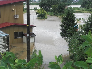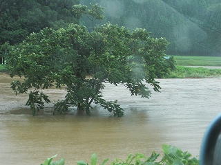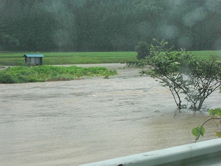 数日来の大雨続きで川が氾濫中! 写真は仁鮒の内川の様子です |