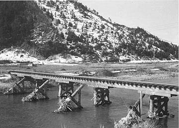 浜頓別軌道様より拝借しました。 昭和41年3月当時の写真です。 背景の山より仁鮒の車庫の 近くの河川敷の貯木場より 対岸に伸びていた木橋と推定。 私が過去に見たあらあゆる 古地図に掲載されることの なかったナゾの軌道です。 この写真をみてはじめて その存在を知りました。 |