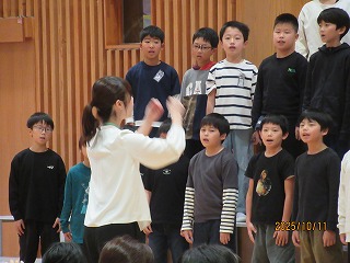 放課後の校舎から,子ども達の歌声が聞こえてきます。合唱部の子ども達です。日々の練習の積み重ねで,美しい歌声がうまれています。8月29日には「能代オペラ音楽祭」に参加して,ベートーヴエンの交響曲第9番を能代オペラ音楽祭合唱団の方々と合唱しました。スポーツ少年団の活躍が目覚ましい第四小ですが,合唱部もすばらしい活躍をしています。文武両道の第四小の子どもたちが頼もしいです。玄関前に掲示されている全校児童の夢のカードの中に,「オぺラ歌手」と書いている子もいます。 うれし~~です。