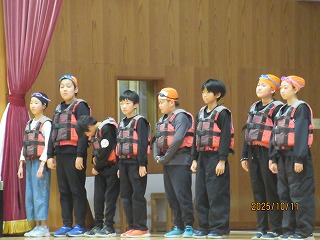 5年生は、着衣泳講習を行いました。こちらも夏休みを控えての水に対する事故から人命を守るため、泳ぎの基本と自己保全、事故防止、溺れた人の救助、応急手当の方法などの知識と技術の講習を受けました。(こちらも日本赤十字社秋田県支部の先生方が講師です)服を着たままでの泳ぐことの大変さと水に浮かぶコツを教えていただきました。
